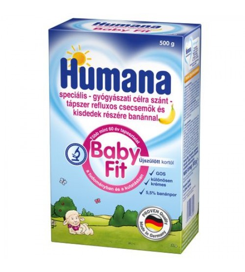 Formula de Lapte praf Humana Baby Fit 500 g - Aliment dietetic pentru scopuri medicale speciale, destinat regimului dietetic al tendintei ridicate de regurgitare,contine toti nutrientii importanti in functie de necesitatile bebelusului.Poate fi folosit de la nastere pana la sfarsitul perioadei de hrana cu biberonul de la nastere pana la varsta de 6 luni ca unica sursa de alimentatie, daca bebelusul nu este alapta de la varsta de 6 luni, ca parte a unei diete mixte si echilibrate. Inainte de a trece la o alta formula sau de a extinde dieta copilului, va rugam sa va adresati medicului dumneavoastra.