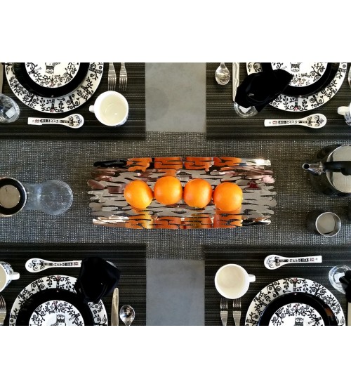 Platou, din otel inoxidabil "Bark", este inspirat de natura padurilor. Designul tunelului permite trecerea aerului, necesar pentru a lasa fructul sa respire si sa-l pastreze proaspat. Profilul sau modelat si dimensiunile importante il fac potrivit pentru a fi utilizat atat ca platou, cat si ca piesa centrala.Cu un design fluid, organic, are o forma subtil curbata si este o capodopera ce atrage atentia in orice moment. Fabricat din otel inoxidabil, este intr-o nuanta argintie, eleganta, ceea ce face designul scoartei si mai dramatic.